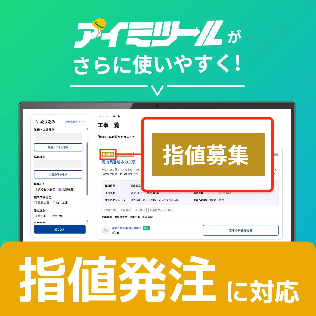 「アイミツール」は、もっと手軽に見積もりを取りたい、下請業者を探したい発注者様、および、中長期的な仕事を確保したい、エリアを拡大して現場を探したい受注者様、双方の課題を解決するために、直接見積もりを送ることができるプラットフォームです。